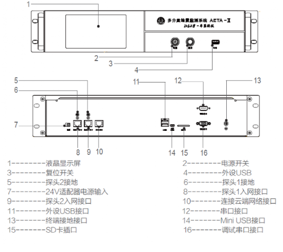 多分量地震监测系统AETA-II由地声传感探头、电磁传感探头、数据处理终端,及监测数据云平台和数据分析系统组成(见图1)。由北京大学深圳研究生院集成微系统科学工程与应用重点实验室研制。主要监测地声和电磁辐射信号,辅助对地温和地震振动信号进行观测,探头放置在地下,通过光缆传输至地面数据处理终端。地声传感探头和电磁传感探头埋设于地下,终端放置在室内。通过有无线互联网(有线或无线网络)将数据传输到云平台。 地面数据处理终端实时对临震、震时、震后过程的地声、电磁辐射,以及地温和地震振动数据进行采集和记录,并实时通过无线网络发往云数据中心,用于地震预报和预警的分析仪器工作。  图 1、AETA多分量综合观测系统 1数据处理终端 功耗:约5w; 重量:整机带包装4kg 形状:高8.5cm,长48cm,宽40cm; 接口:如图2所示; 固定:导轨固定在标准电信机柜或直接放置在桌面。  图 2、AETA数据终端外观说明 2 地声传感探头(见图3) 功耗:约3w; 重量:整机带包装11kg; 形状:高9cm,椭圆长轴26cm,短轴16cm; 接口:供电&数据传输一体的网口,以及接地扣; 线缆:铠装电缆,长40m,直径1cm,弯折角度大于135°; 固定:水泥覆盖四周;  图 3、地声传感探头说明 3 电磁传感探头(见图4) 功耗:约3w; 重量:整机带包装16kg; 形状:高92cm,直径35cm; 接口:供电&数据传输一体的网口,以及接地扣; 线缆:铠装电缆,长40m,直径1cm,弯折角度大于135°; 固定:地下安装则水泥覆盖,山洞安装则使用三脚支架。  图 4、电磁传感外观说明 AETA多分量地震监测系统的特点: 本地数据:分析和处理地面数据处理终端对地声和电磁辐射信号进行功率谱和时频分析,将分析结果传输至云数据中心。 本地存储:支持本地存储30天原始数据和预处理数据。 远程软件维护:地面数据处理终端可实现远程软件系统更新,支持信号的分析和处理方法可以根据需要进行远程更换、更新和扩充,同时本地与云端的通信协议、控制方式均可在软件层面修改。 电池续航时间1周,本地存储30天,设备和安装成本小于10万,便于大规模架设。 AETA多分量地震监测工作项目: 地声监测:监测频段0.5Hz到800kHz@60dB,从次声波、声波到部分超声波波段; 电磁监测:监测0.1Hz~10kHz,0.1nT~1000nT,较宽动态范围的甚低频、超低频电磁波段; 地温监测:监测震中区域恒温层温度变化,-55℃~+125℃,±0.5°C; 地震波监测:采用MEMs加速度观测地震振动; |