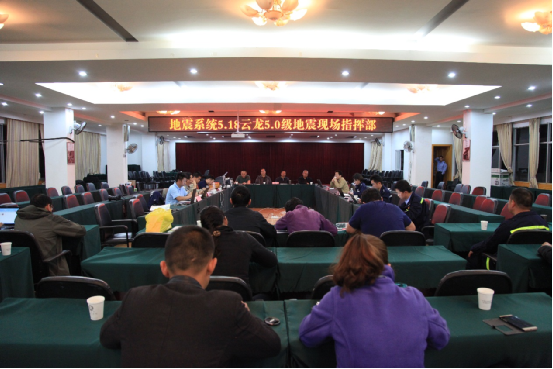 2016年5月18日云龙5.0级、洱源4.6级地震发生后,云南省地震局在大理州地震局、云龙县地震局、县政府办公室大力配合支持下,于5月18日凌晨在云龙宾馆搭设成立了“地震系统5.18云龙5.0级地震现场指挥部”。 指挥部搭建成功后,各小组投入紧张工作,开展烈度评定、灾害损失调查、震情分析、流动台站架设、应急通讯、科学考察等工作,并积极协助当地党委政府开展抗震救灾工作。现场指挥部由省、市、县3级地震部门共同组成,其中云南省地震局33人(9辆车),大理州地震局4人(1辆车),云龙县地震局6人(1辆车)。