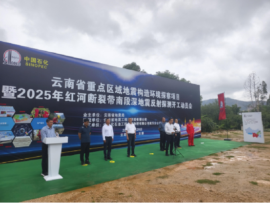 项目实施单位云南省地震工程勘察院有限公司、项目深地震反射探测施工单位中石化石油工程地球物理有限公司南方分公司负责同志在动员会上发言。