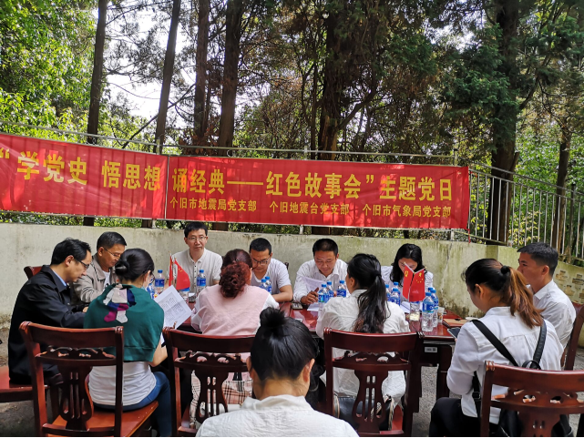 ——红色故事会”主题党日活动 为深入开展好党史学习教育,引导广大党员和干部职工继承党的优良传统,锻炼品格意志,锤炼坚强党性,更加自觉地做好本职工作,个旧地震台党支部与个旧市地震局党支部和个旧市气象台党支部共13名党员于4月30日下午,联合在个旧地震台院内开展“学党史 悟思想 诵经典—红色故事会”主题党日活动。 活动以“奋斗百年路 启航新征程”为主题,在庄重、严肃、认真的氛围中8位党员分别讲述了《遵义会议》《红军山炮连的来历》《叶挺请求重新入党的申请书》《湘江战役》《杨靖宇将军的英雄事迹》《党的好干部焦裕禄》《杨善洲老书记事迹的点滴感悟》《朝鲜战争中的中国空军》,这些经典历史故事体现着中国共产党人强烈的使命担当和行动自觉,让每一名与会党员热血澎湃,心灵受到震撼、精神受到洗礼,思想引发共鸣,更加懂得今天的幸福生活来之不易。通过分享党的经典历史故事的方式,歌颂中国共产党建党一百年来的光辉历程和伟大成就,大力发扬红色传统、传承红色基因,赓续共产党人精神血脉。我们要继承革命先辈的遗志,增强“四个意识”,坚定“四个自信”,做到“两个维护”,努力做好本职工作,以优异的成绩迎接建党一百周年。