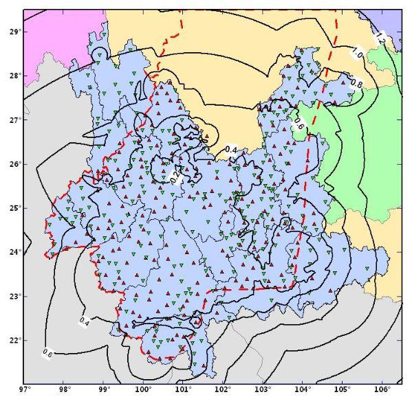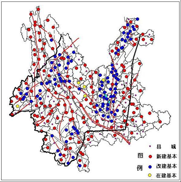 项目建成后云南省地震预警能力图 二、预警工程云南分项目建设内容 预警工程云南分项目建设主要包括台站观测系统、数据处理系统、紧急地震信息服务系统、通信网络系统、技术支持与保障系统五个部分。 台站观测系统主要包括建设203个基准站(新建145个,改建58个)、233个基本站(新建119个,改建114个)和810个新建一般站,建设完成后三类台站的总数达到1246个。