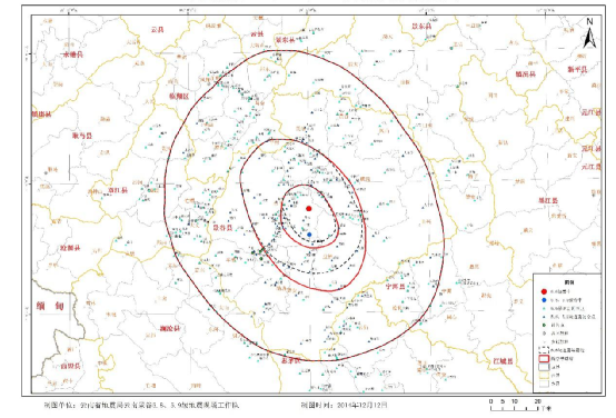 2014年10月7日21时49分,云南省景谷县(北纬23.4°,东经100.5°)发生6.6级地震。 地震发生后,中国地震局、云南省地震局立即启动了地震应急预案Ⅱ级响应。中国地震局有关司室、云南、四川等省级地震部门共14个单位以及普洱、临沧、昆明等州市县地震部门的226名现场工作人员赶赴灾区开展地震现场应急处置工作。  2014年10月7日景谷县6.6级地震综合烈度图(虚线为本次等震线) Ⅵ度区及以上总面积约11930平方千米,其中,Ⅷ度区总面积400平方千米,Ⅶ度区总面积1750平方千米,Ⅵ度区总面积9780平方千米。 Ⅷ度区东起景谷县威远镇文朗村中寨,西至永平镇芒费村七七队,北自威远镇文郎村附近,南到碧安乡乡官寨。 Ⅶ度区东起景谷县威远镇永安村,西至永平镇新塘村,北自临翔区平村乡政府驻地,南到益智乡石寨村。 Ⅵ度区东起景谷县正兴镇黄草坝至宁洱县宁洱镇荒田村一带,西至双江县勐勐镇石板坡村以东,北自云县大朝山西镇菖蒲塘村一带,南到思茅区龙潭乡麻栗坪。 本次地震造成直接经济总损失511020万元。  景谷县永平镇芒费村七七队土木房屋毁坏  景谷县永平镇政府砖混结构办公楼破坏 |