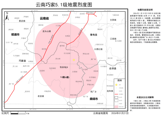 2026年1月19日19时32分在云南省昭通市巧家县(北纬27.01度,东经103.41度)发生5.1级地震。此次地震最高烈度为Ⅵ度(6度),等震线长轴呈北北西走向,长轴21公里,短轴16公里,Ⅵ度(6度)区面积约275平方公里,主要涉及昭通市巧家县、鲁甸县,曲靖市会泽县,共计2市3县5个乡镇。Ⅵ度(6度)区涉及昭通市巧家县包谷垴乡、老店镇,鲁甸县龙头山镇、火德红镇;曲靖市会泽县纸厂乡,共计5个乡镇。