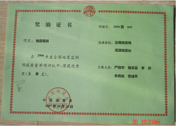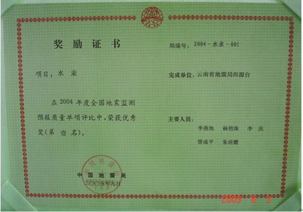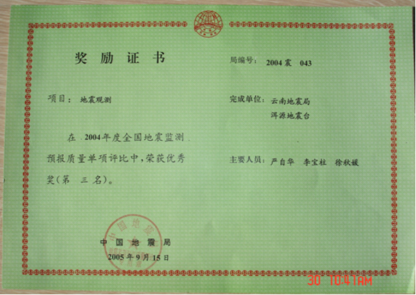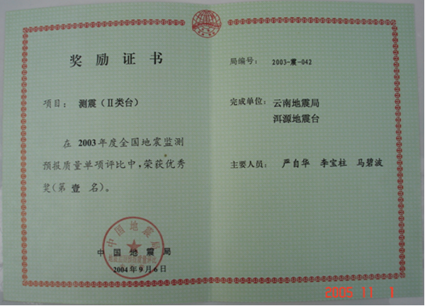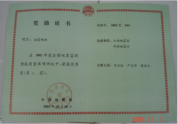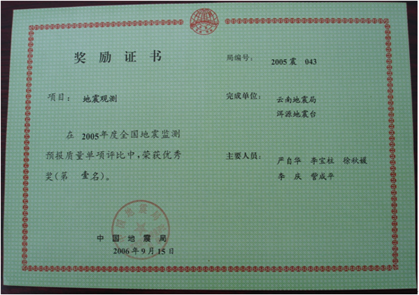 洱源地震台建台三十多年来,台站职工在工作中兢兢业业、一丝不苟,爱岗敬业,默默无闻,乐于奉献,获奖成果丰硕,地震监测、地震预报和科研工作走在了全省乃至全国地震台站的前列。至今已获得40项(次)全国评比前三名。省内评比,至今已获得近100项(次)第一名。开展完成一项地震行业专项课题,四项中国地震局三结合课题,一项云南省地震局青年基金课题,与中国局学科组、北京大学地球物理系等单位进行过合作实验研究。获防震减灾优秀成果奖8项,获云南省地震局预报二等奖1次,获云南省地震局科技进步奖4项,多次被评为先进台站。 2009年2月,洱源地震台被国家人力资源和社会保障部与中国地震局联合评选为全国地震系统先进集体。