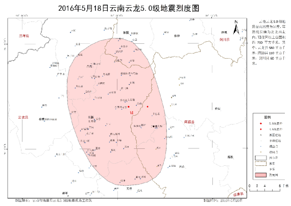 烈度图 Ⅵ度区范围:Ⅵ度区涉及大理州云龙县、洱源县、剑川县,东起洱源县西山乡山高组,西至云龙县检槽乡清文村,北自剑川县象图乡松平—石登一带,南到云龙县关坪乡酸坪—胜利一带。 Ⅵ度区以外,云龙县团结乡、宝丰乡、诺邓镇,剑川县弥沙乡、沙溪镇、马登镇,永平县、兰坪县的个别乡镇少数民房遭受轻微破坏。 |
