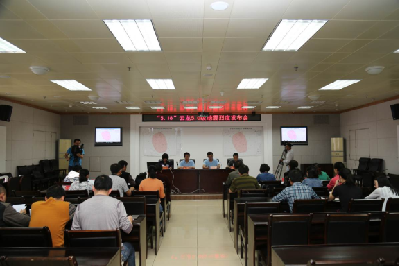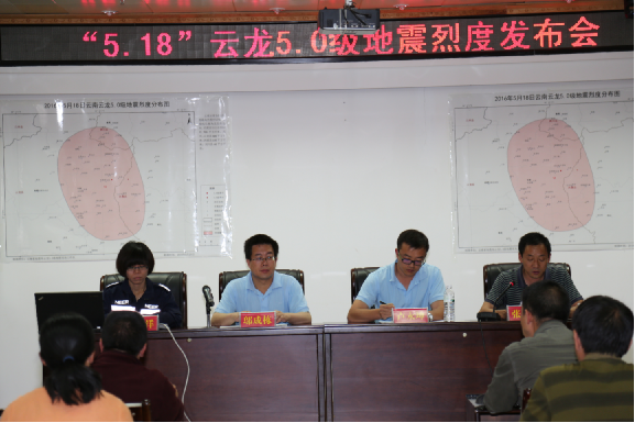 2016年5月21日上午9点,地震系统现场指挥部在云龙县人民政府组织召开了“5·18”云龙5.0级地震烈度发布会。 会上,地震系统现场指挥部灾害损失评估组负责人、云南省防灾研究所副所长、高级工程师卢永坤介绍了本次地震灾害损失调查工作情况,并向新闻媒体公布和解析了地震烈度图。地震系统现场指挥部震情监视组负责人、云南省地震预报研究中心副主任、副研究员邬成栋就本次地震相关情况回答了记者提问。 云南日报、春城晚报、大理日报、大理州人民广播电台、大理州电视台、大理新闻网、云龙广播电视台、云龙新闻网等新闻媒体参加了发布会。