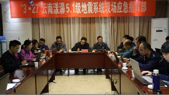 2017年3月29日晚,漾濞5.1级地震现场指挥部召开第三次工作会议。皇甫岗局长亲临指挥部检查指导工作,出席工作会议并讲话。会议由陈勤指挥长主持。 皇甫岗局长传达了中国地震局局长郑国光、副局长阴朝民、牛之俊及云南省委书记陈豪、省长阮成发、副省长张祖林等领导对本次地震的批示精神,同时对本次地震应急处置工作给予充分肯定。在听取现场指挥部汇报之后,皇甫岗局长对现场应急工作提出4点要求:一是各级党委政府、中国地震局党组高度重视漾濞5.1级地震抗震救灾工作,大家要认真领会、切实贯彻各级领导的指示批示,努力完成好本次地震应急工作。二是本次地震很好地把握了震情形势,要紧盯震情,密切跟踪,不能松懈。三是指挥部现场工作高效有序,各工作组要尽心竭力,做好震情跟踪、灾害损失评估工作,交出满意答卷。四是要加强纪律性,做一支守纪律、讲规矩、能战斗的优良队伍。 陈勤指挥长表示要切实贯彻落实皇甫岗局长做出的指示要求,善始善终,保证地震应急工作顺利完成。 会上,各指挥长就几日来的应急指挥工作发表讲话。综合协调组、灾评科考组、震情监视组、新闻宣传组和综合保障组汇报了本日工作情况和明日工作计划。