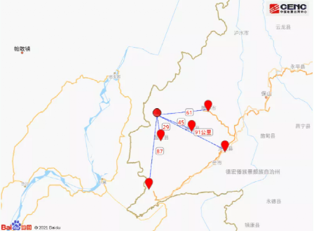 震中距盈江县29km、距梁河县45km、距腾冲市61km、距陇川县87km、距龙陵县91km,距德宏傣族景颇族自治州92km,距昆明市486km。