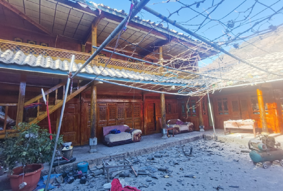 拉瓦村房屋受损 永安镇周边村落由于自身海拔的缘故,加之最近正值冬末。叶阳在前往镇上的途中感冒了。当天,小组先走遍了泥鳅沟村、者波桥村、达迦林寺等地点进行灾评,当我们最后到达永安镇扎美喇嘛寺时,他依旧满是干劲,从车内一跃跳到地上。寺内主持见到来人,快步迎了过来。不等他开口,叶阳便说到,“你好,我是云南省地震局灾害损失评估小组的,听说你们这里报了灾,我们来看看”。主持接着道,“噢噢,好,你们跟我来”。他带着我们绕着佛寺转了一圈,又带着我们爬上吉德殿殿顶。地震让殿内的佛像出现破损,墙体出现开裂,房顶上的椽子也掉了下来。“你们跟我从外面来看看”,“你们看,这个大殿整体向前倾了,再来一次这样的大地震,这房子恐怕就要到了,你们一定要记得给我们反映一下呢”。叶阳说道:”我们会核查清楚,实事求是地将情况记录下来,并反映给指挥部的。您放心,还有没有其他受损的情况,麻烦您也带我们看一下?”这个在车上寡言少语的年轻小伙,工作起来却满是干劲,他总想着再多拍一些震害照片,再多记录一些现场情况。土木专业出身的他,看到房屋的裂缝,换做别人总是避而远之,但他反而会“痴迷”地凑上去研究,将脸贴到墙上,以一种“夸张”的样子想要看清楚里面的结构和材料。他看到我一脸不解的看着他,只是笑笑,然后就与我一同前往下一家查灾。