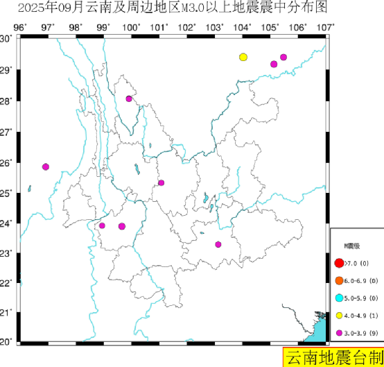 2025年09月云南及周边地震活动概况:云南及周边地区(北纬20°~30°,东经96°~107°)共发生地震1757次。按M统计,其中M3.0~3.9级9次、M4.0~4.9级1次,该区域最大地震为09月15日16时42分四川犍为M4.0级地震,省内最大地震为09月19日09时18分云南耿马M3.6级地震。(注:M为国家标准震级)
