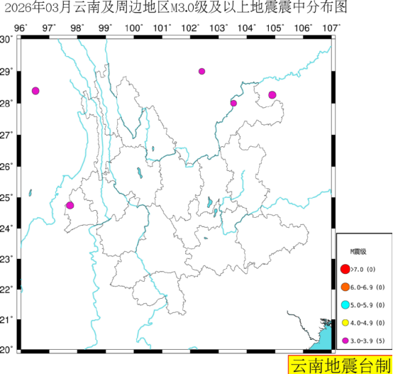 2026年03月云南及周边地震活动概况:云南及周边地区(北纬20°~30°,东经96°~107°)共发生地震1874次。按M统计,其中M3.0~3.9级5次,无M4.0级及以上地震,该区域最大地震为03月27日02时42分四川兴文M3.9级地震,省内最大地震为03月31日23时45分云南盈江M3.7级地震。(注:M为国家标准震级)